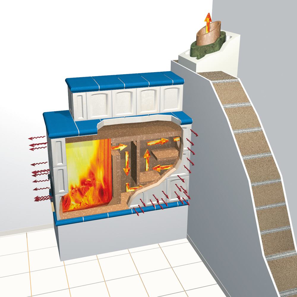 Dabei strömt Luft durch einem ca. 10cm breiten Luftschacht zwischen der Außenwand des Ofens und dem Heizeinsatz. Im Sockelbereich des Kachelofens befinden sich Öffnungen, über die kühle Raumluft in den Ofen einströmt. An den heißen Oberflächen des Heizeinsatzes erwärmt sich die Luft, steigt auf und strömt durch die oberen Öffnungen als Warmluft zurück in den Wohnbereich.