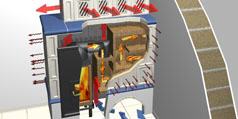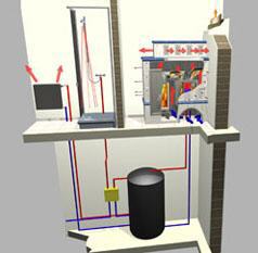 Durch ein Leitungssystem im ofeninneren strömt Wasser, dieses wird über einen Wärmetauscher erhitzt.